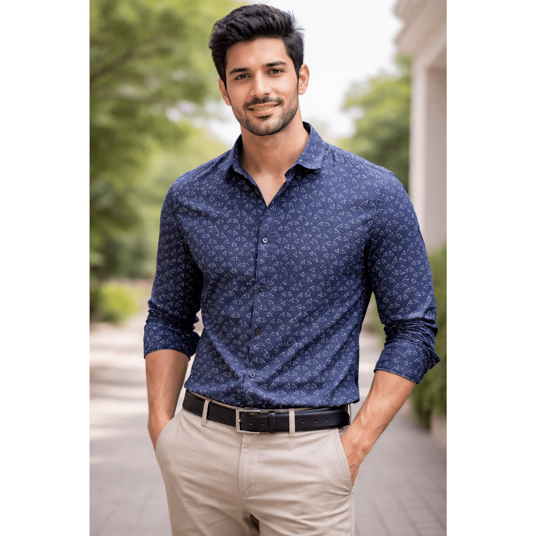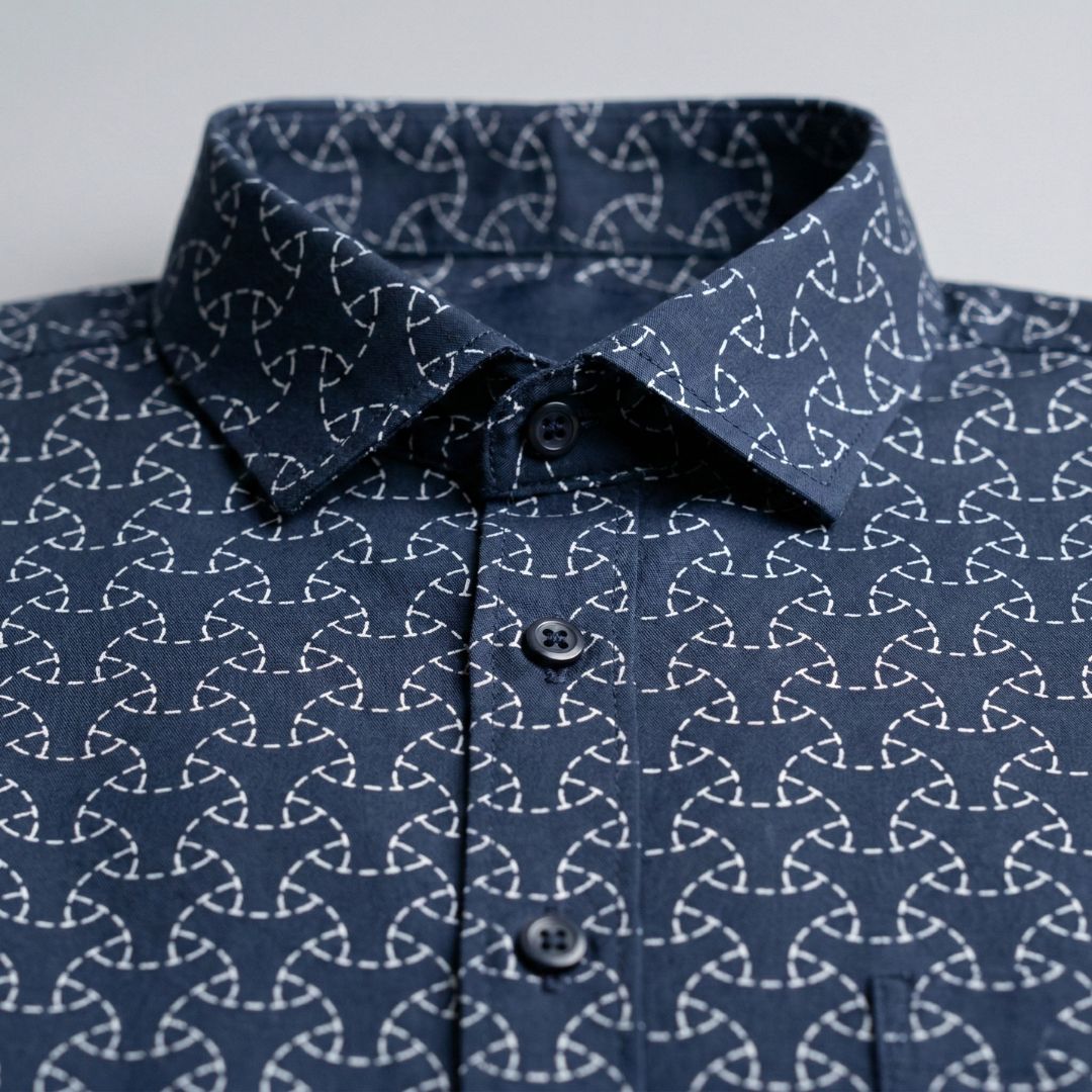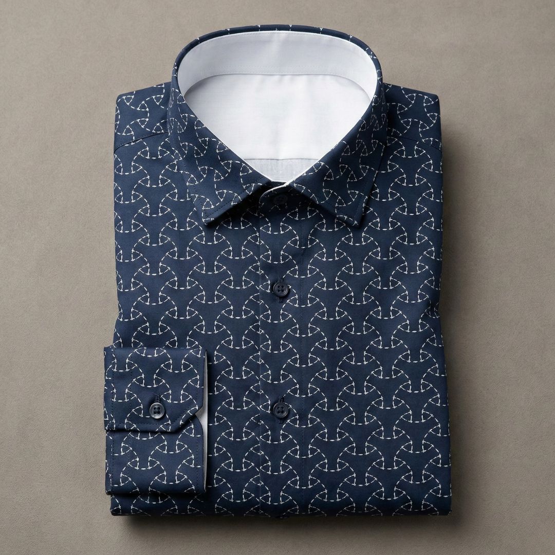 Redefine your smart-casual wardrobe with our Azure Geometric Printed Shirt. Designed for the modern professional, this shirt features a subtle yet intricate circular geometric pattern set against a deep indigo base, offering a sophisticated alternative to solid colors.
